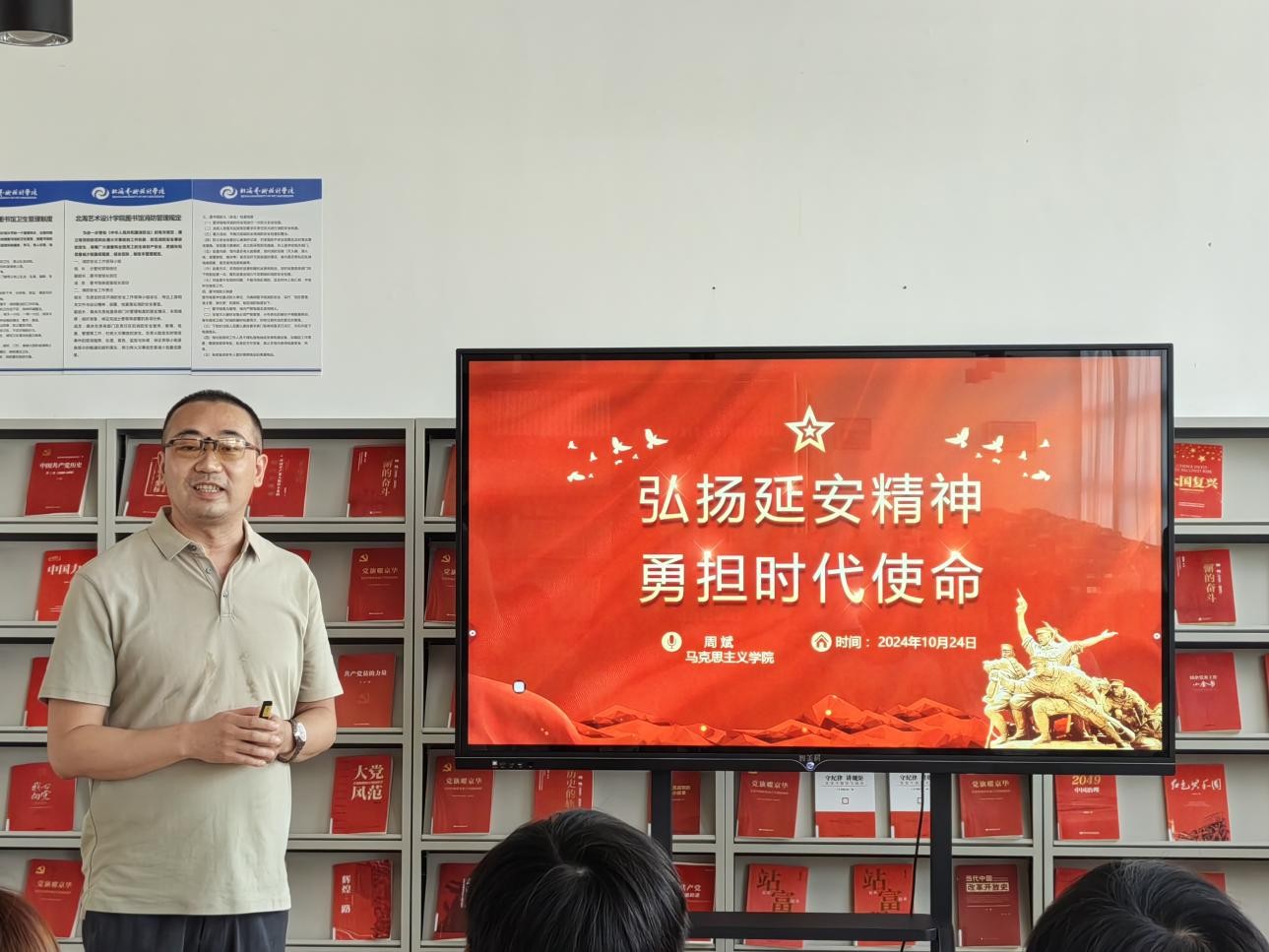 10月24日下午3:00,周斌老师在图书馆三楼“红色阅读角” 举办红色知识专题讲座,本期讲座的主题是弘扬延安精神 勇担时代使命。我校动画与传媒学院积极分子到场聆听讲座并参与互动,氛围良好,同学们纷纷表示受益匪浅。(张家梅摄)