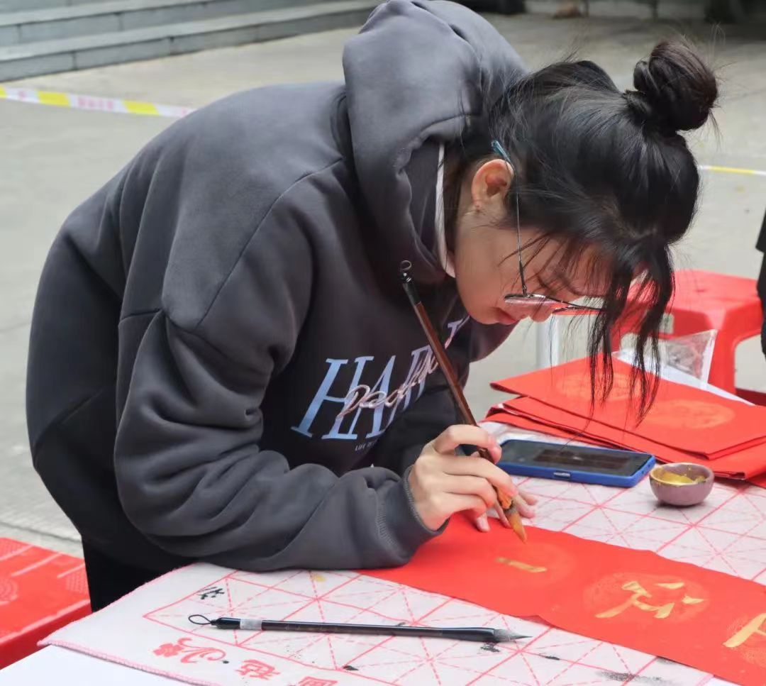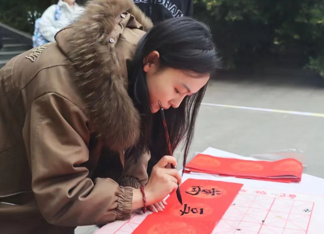 本次活动是由招募的志愿者人员进行现场书写春联,在寒风凛冽中每位志愿者紧握手中灼热的笔杆书写出对美好未来的憧憬与期盼。志愿者一起挥毫泼墨,用或丰实厚重,或飘逸潇洒的笔触,满怀热情地写下一幅幅饱含美好祝福的春联。正所谓无联不成春,有联春更浓,他们挥毫笔墨、走笔游龙,笔尖点缀着人间烟火气息,赢得在场学生阵阵赞誉。“爆竹四起接五福,梅花一枝报三春”、“福如旭日腾云起,财似春潮乘风来”、“国泰民安逢盛世,风调雨顺颂华年”一幅幅春联里都承载着新春最诚挚的祝福。