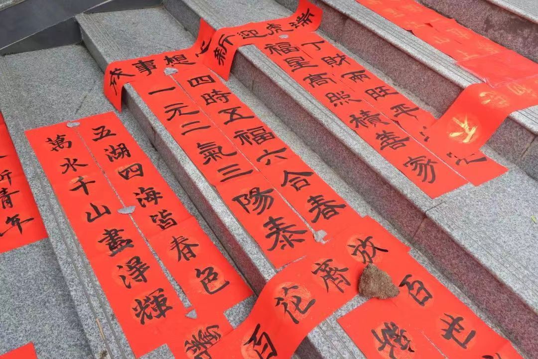 尽管寒风阵阵,也挡不住现场志愿者们的热情。春联在工作人员的帮助下,有序地排列在台阶之上晾干笔墨。