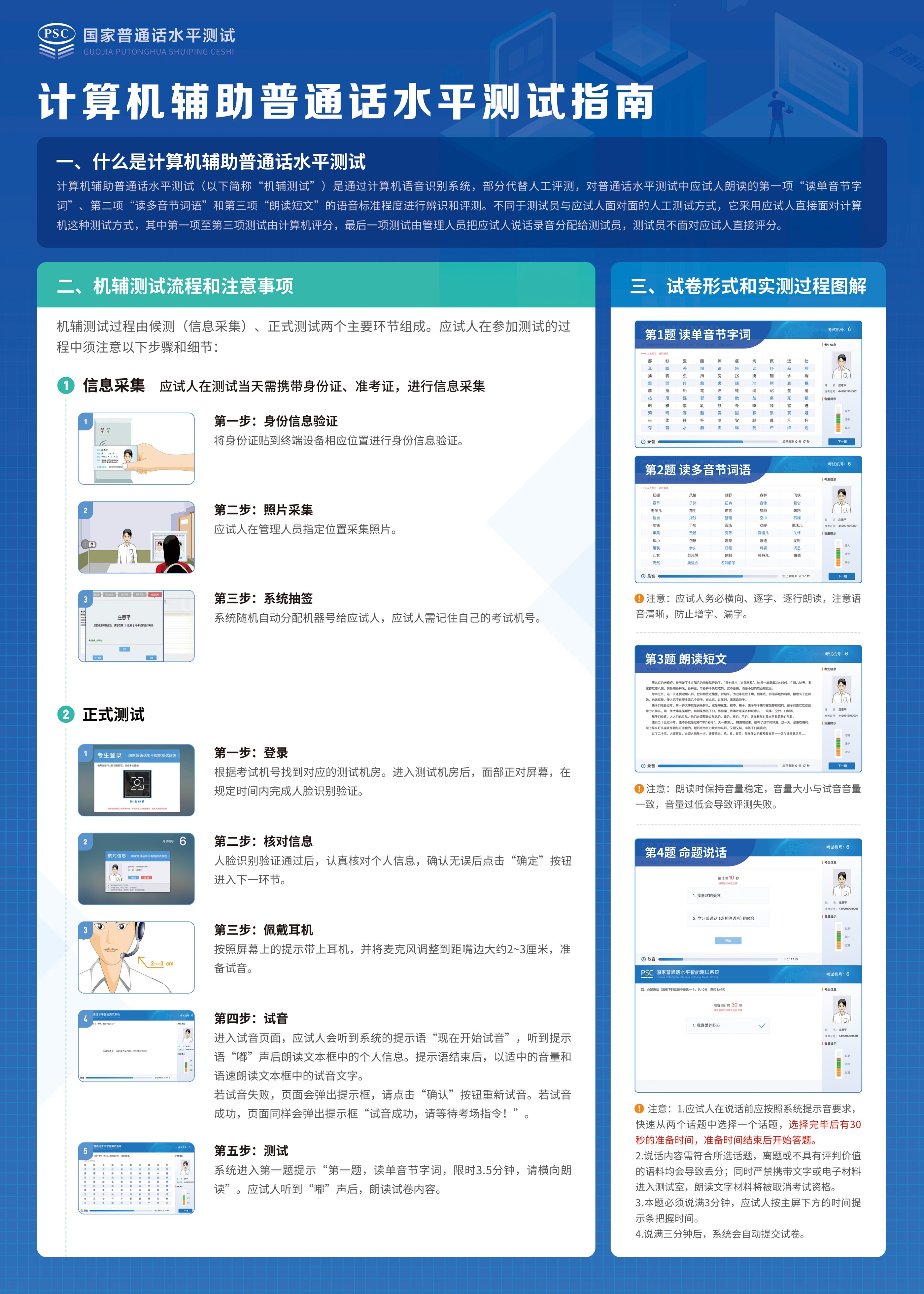 考试流程。具体考试流程按照计算机辅助普通话水平测试指南(附件2)、普通话水平测试考试指南(附件3)执行。