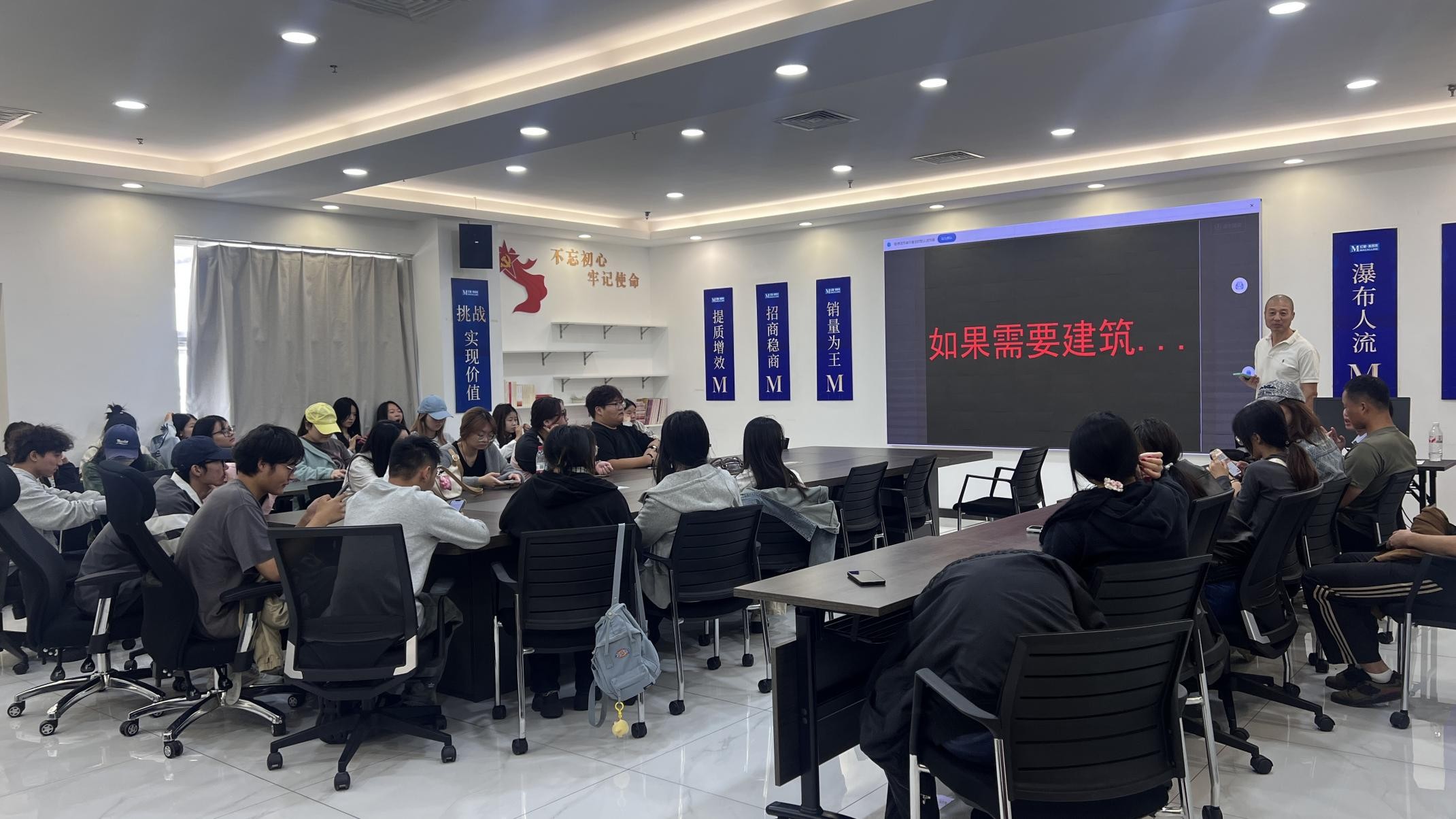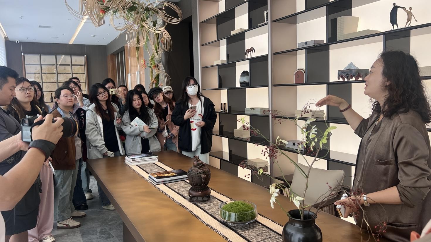 活动还邀请玛格・极品牌方经理专题分享品牌场景构建与发展规划。学生实地参观各大品牌展厅,触摸樱桃木、红橡木等材质纹理,观察榫卯金属装饰与弧形工艺细节,结合讲解理解材质工艺适配场景;同时通过测量空间布局、分析家具搭配与灯光设计,将“空间设计理论”转化为“实际呈现效果”,深化对材质、工艺、市场趋势的认知,强化理论实践结合能力。