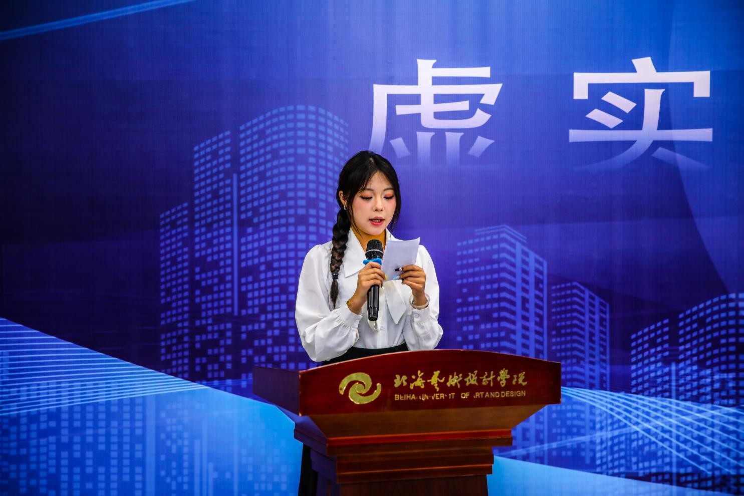 下午五时,颁奖典礼在主持人的热情开场中拉开帷幕。主持人对出席嘉宾与师生表示热烈欢迎,并阐释活动核心意义:通过展示2025级学子在《环境设计概论》课程中的学习成果,呈现他们对环境设计学科的初步探索与创意表达,为师生搭建交流互鉴、共同进步的桥梁。