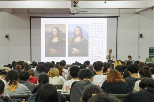 讲座伊始,北畠耀教授以幽默风趣的语言对达芬奇个人以及蒙娜丽莎作品展开了专门介绍。他以具象四个部分展示达芬奇辉煌成就的一生经历。北畠耀教授表示世人对达芬奇的历史评价极高,达芬奇的才能在丰富多彩的领域中得到了极大发挥,北畠耀教授还列举总结了达芬奇在八个领域下的才能并通过讲述达芬奇绘画蒙娜丽莎作品的趣事经历,引导广大师生勤于思考,强化观察能力,追求完美,从而提高自身创作的水平。
