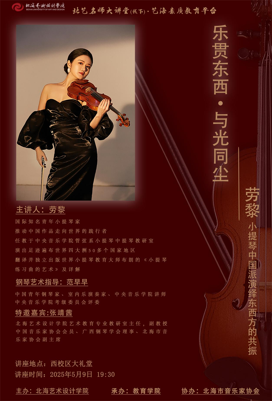 5 月 9 日晚,为深化美育教育实践、提升学生的艺术修养,学校特邀国际乐坛备受瞩目的中国小提琴演奏家、中央音乐学院管弦系劳黎老师到校,开展以 “乐贯东西・与光同尘” 为主题的音乐讲座,用灵动的琴弦编织出跨越国界的艺术对话。我校校长卢新华,副校长包建明,总督学王斌,纪委书记王照伟,教育学院院长熊秀峰、副院长蒙剑英等领导出席活动。同时,活动受到了北海市文艺界与教育界的广泛关注,北海市音乐家协会主席林海等众多社会各界的音乐爱好人士莅临活动现场。