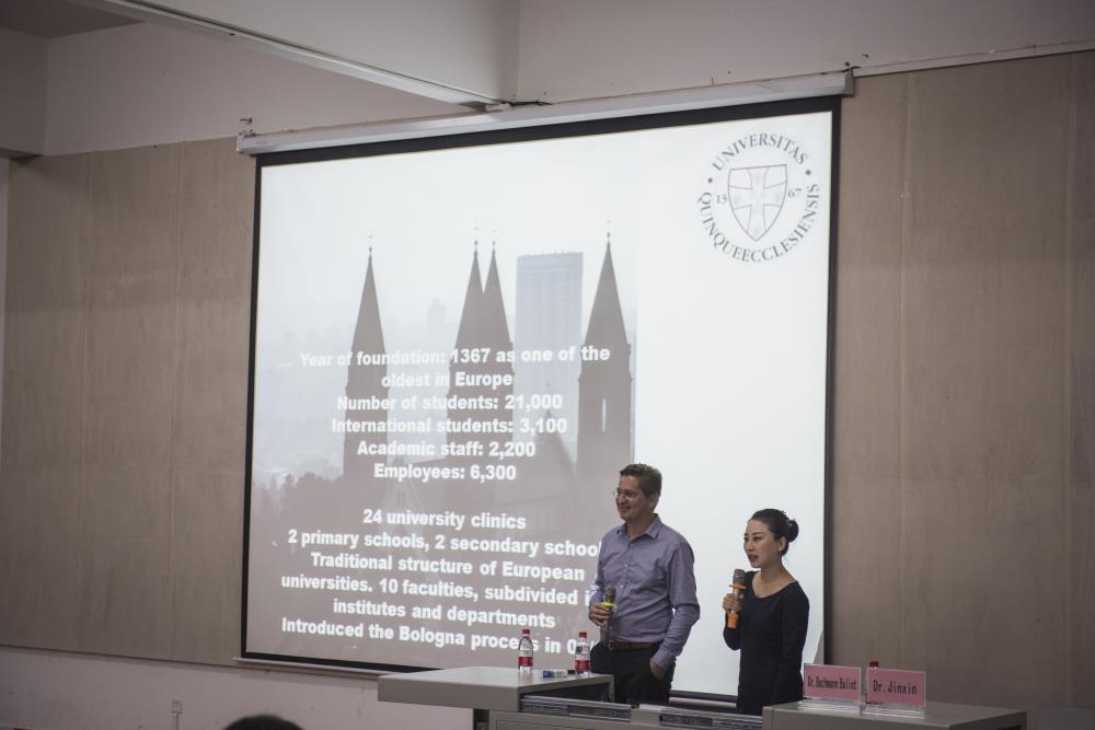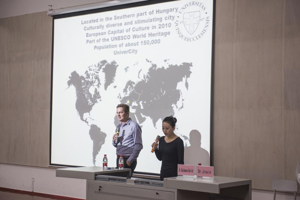 Balint教授首先做了自我简介,随后他用PPT展示了匈牙利周边郊区的建筑设计并介绍了佩奇大学的地理位置和人口数量。Balint教授说:学校由国王建立于1367年,明年将迎来她的650周年生日。