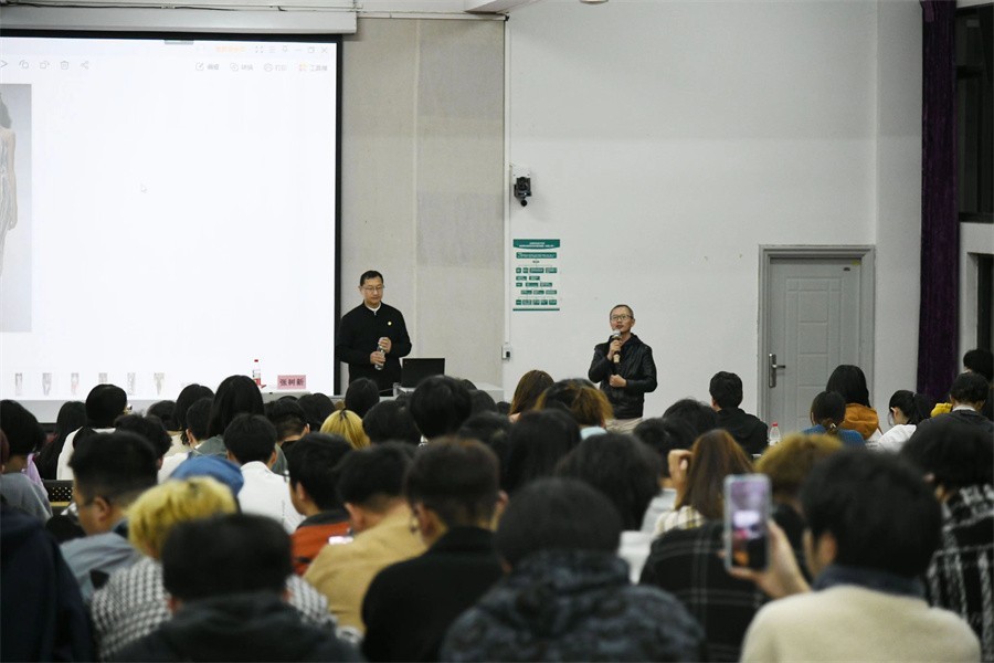 讲座最后,张树新教授以现代设计为实例,并结合自身造诣,提出空灵感可以在服装、包装、雕塑、平面、书法等多方面体现,并希望广大师生能够从多个领域、多个方面发现灵感并将其巧妙结合,创作出更具有视觉舒适感的作品。