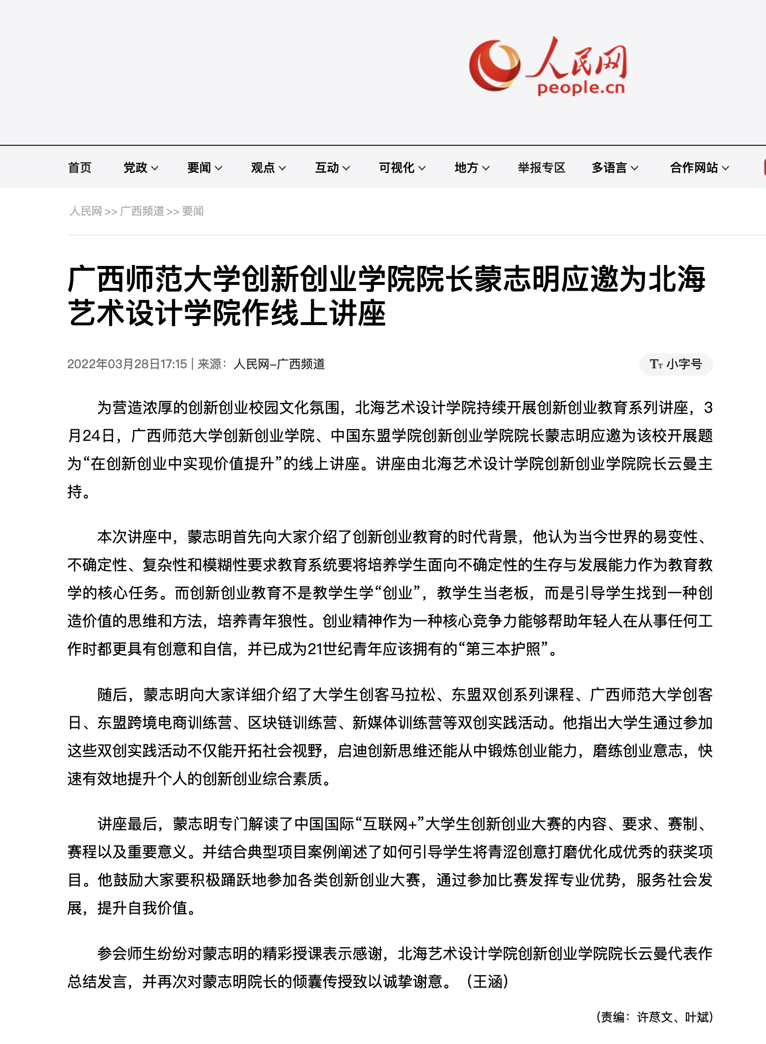 人民网:广西师范大学创新创业学院院长蒙志明应邀为北海艺术设计学院 作线上讲座