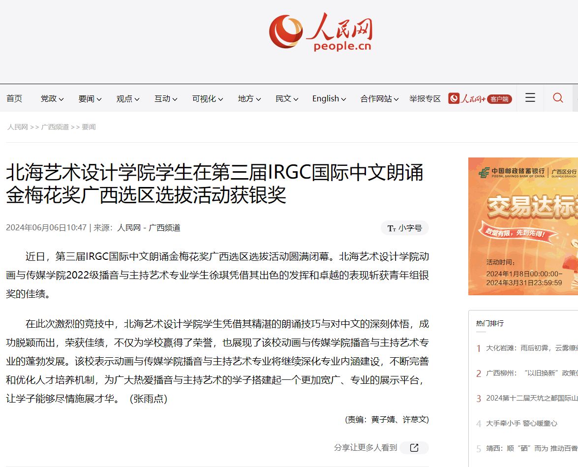 人民网:北海艺术设计学院学生在第三届IRGC国际中文朗诵金梅花奖广西选区选拔活动获银奖