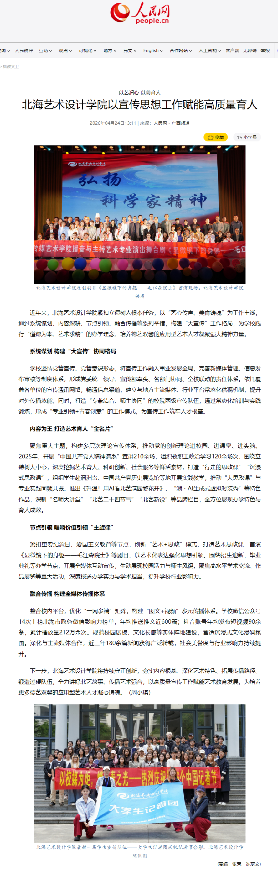 人民网:以艺润心 以美育人——北海艺术设计学院以宣传思想工作赋能高质量育人