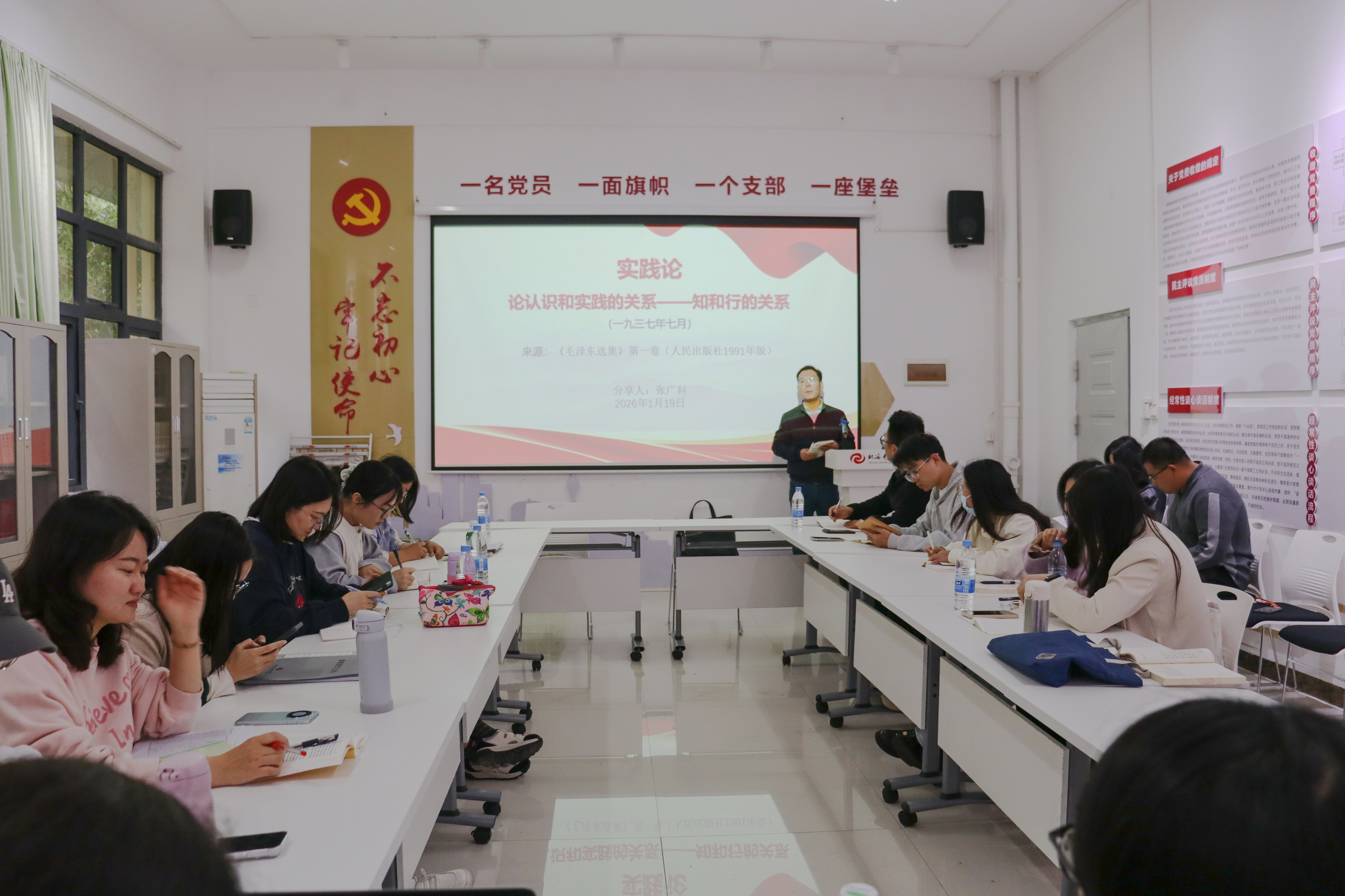1月19日,马克思主义学院在西校区行政楼103红色驿站举行第三期马克思主义经典著作读书第三次活动。活动由马克思主义学院副院长张宇飞主持。马克思主义学院习近平新时代中国特色社会主义思想概论及国家安全教育教研室主任张广科副教授以《实践论》为基础,作了题为《实践论:论认识和实践的关系——知和行的关系》的分享,马克思主义学院全体中青年教师参加活动。
