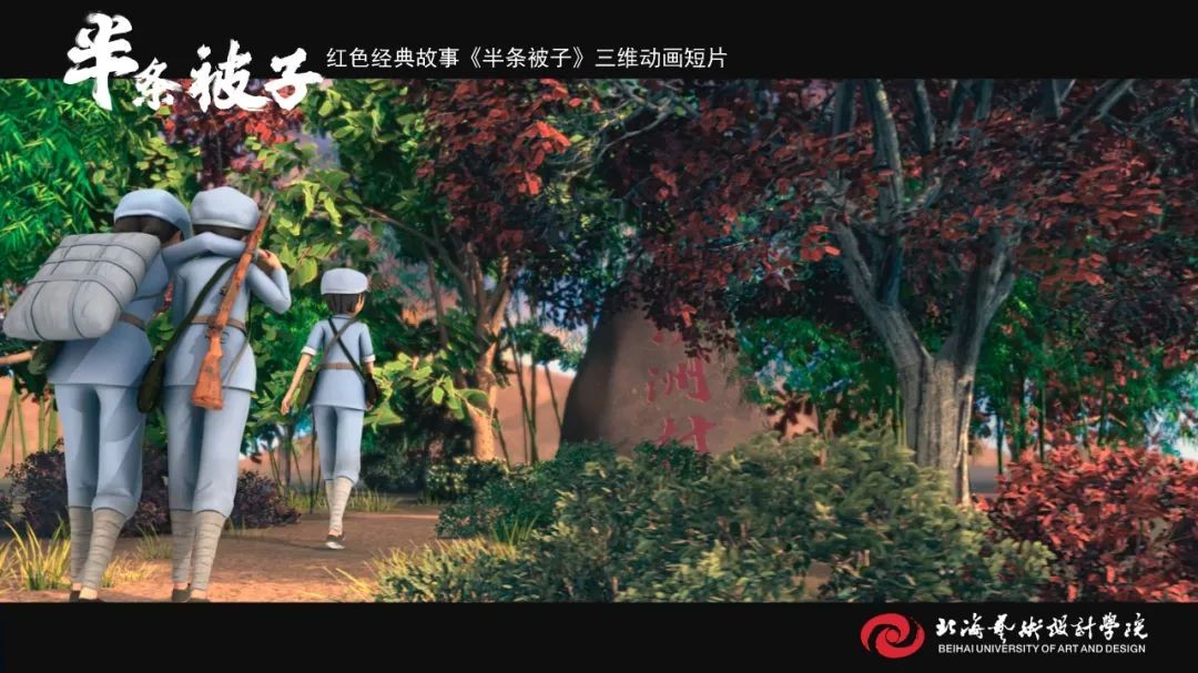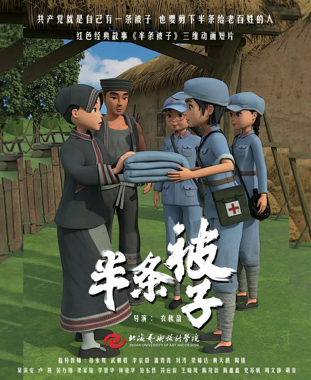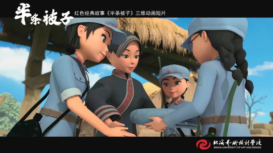 《半条被子》师生创作团队 《半条被子》是我校动画与传媒学院18级在校学生在“建党百年”命题下制作的动画短片作品,取材于纪念红军长征胜利80周年大会上,习近平总书记讲述了82年前发生在湖南汝城县的“半条被子”的感人故事。3名女红军借宿在湖南汝城县沙洲村村民徐解秀家临走时,将自己仅有的一床被子剪下一半送给老人。什么是共产党?共产党就是自己有一条被子,也要剪下半条给老百姓的人。