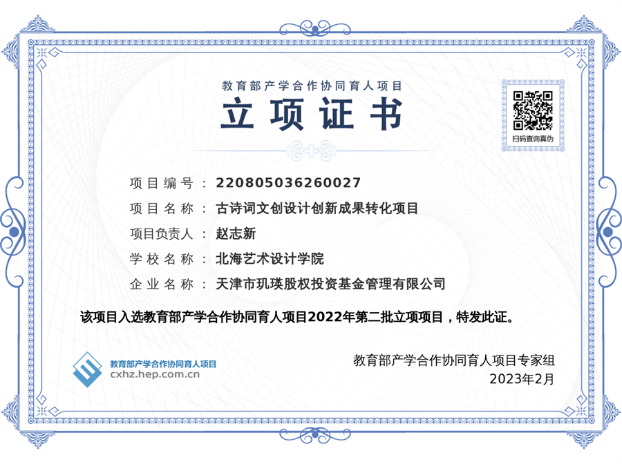 近日,教育部高等教育司发布了《关于公布2022年第二批产学合作协同育人项目立项名单的通知》,我校设计艺术学院赵志新老师申报的《古诗词文创设计创新成果转化项目》成功获批立项。