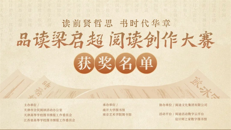 近日,由天津市全民阅读活动办公室、天津高等学校图书情报工作委员会、江苏省高等学校图书情报工作委员会主办的“品读梁启超 阅读创作大赛”的活动线上发布了获奖名单。我校学生作品征文类获得二等奖1名、优秀奖2名;书画类获得一等奖1名、三等奖2名、优秀奖6名;视频类获得一等奖1项、二等奖1项、三等奖4项、优秀奖5项。我校图书馆被评为“经典推广先进单位”“优秀组织单位奖”,学校教师喻广林、熊东等获优秀指导老师奖。