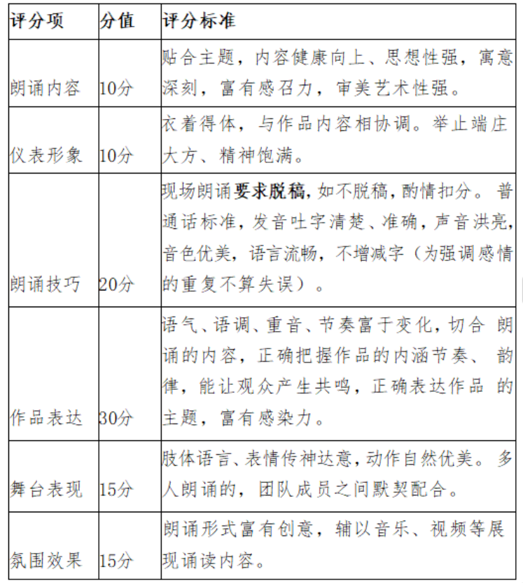 备注:朗诵内容时长控制在5~5分钟之内,现场超时或不足,或现场未脱稿,均属于扣分项,扣分标准以现场评委商定结果为准。