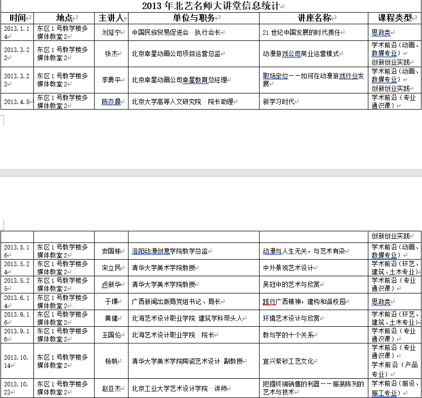 2013年北艺名师大讲堂信息统计