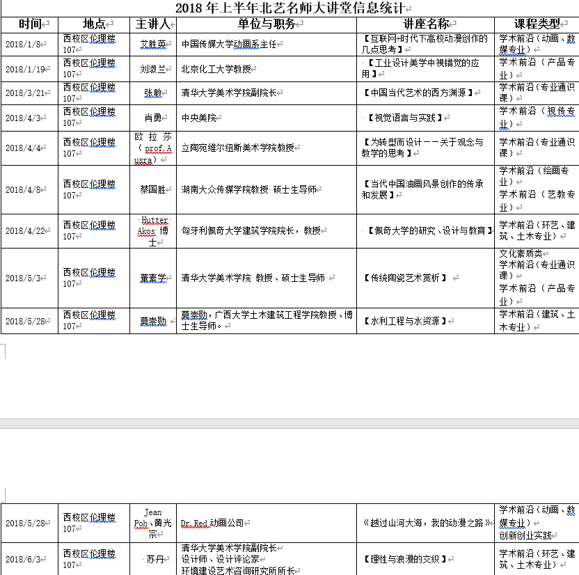 2018年上半年北艺名师大讲堂信息统计