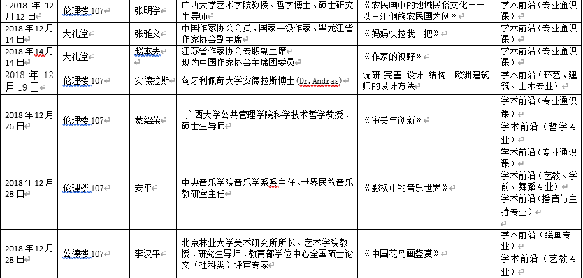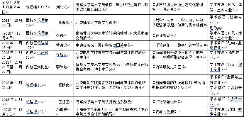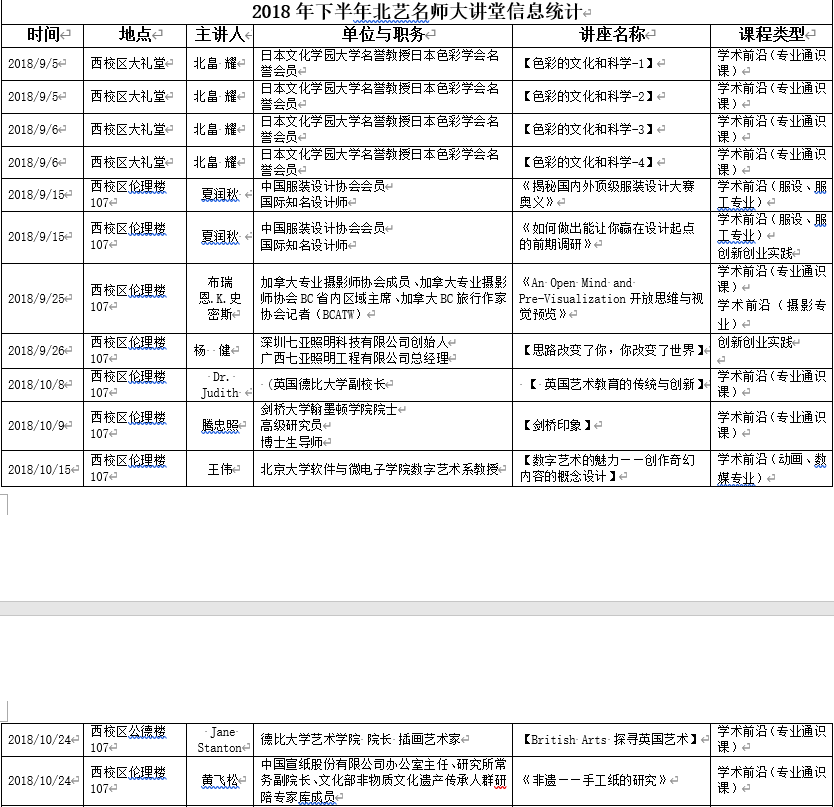 2018年下半年北艺名师大讲堂信息统计