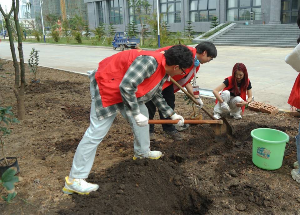 志愿者们植树的背影组成了校园中一道靓丽的风景线,一棵棵小树苗被栽下,南校区被一点点新绿缀满,同学们也在植树的过程中了解到许多有关树木的知识,认识到树木对于环境的重要 此次活动,我校师生以实际行动践行“绿水青山就是金山银山”的理念,为推进北海市创建文明城市工作贡献自己的一份力量。同时,充分发挥了团结协作、吃苦耐劳的精神,弘扬了志愿者“奉献、友爱、互助、进步”的精神。 溢一缕春光 种一丝新绿 换一片希望 在这阳春三月里 一起来种棵树吧(林修竹、黄韵露/摄)