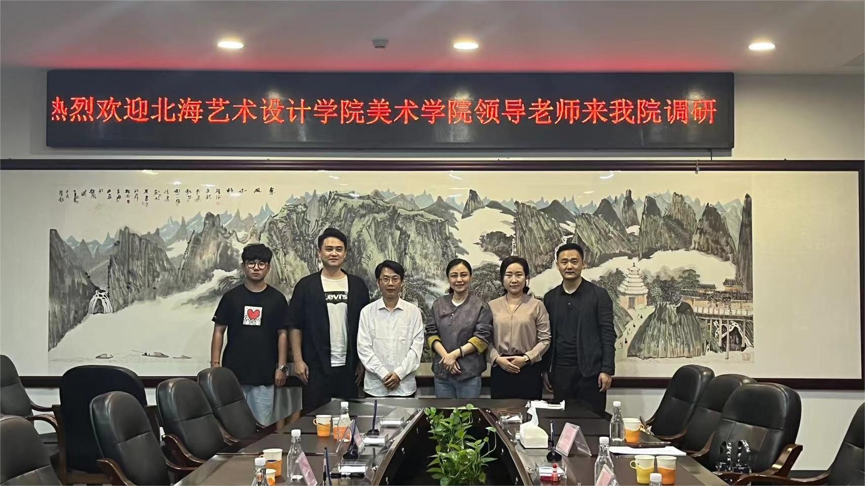 随后,两校教师代表在会议室就学科发展、专业建设以及未来合作规划等问题进行深入交流。出席交流会议的两校教师代表分别是北海艺术设计学院美术学院书法学教研室主任苏乃从、副主任宁梦宇、教师李东垚,广西艺术学院中国画学院/漓江画派学院书法系主任吴善贞、副主任赵雪飞以及金玟廷博士。