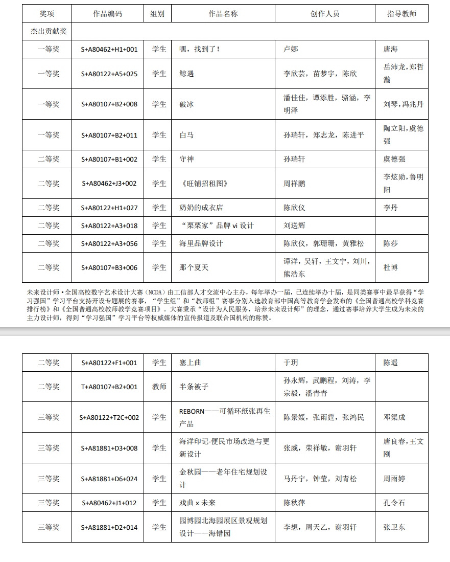 据悉,未来设计师·全国高校数字艺术设计大赛(NCDA)由工信部人才交流中心主办,是同类赛事中最早获得“学习强国”学习平台支持开设专题展的赛事,有着广泛的影响力。大赛秉承“设计为人民服务,培养未来设计师”的理念,鼓励大学生积极参与创新设计,提高自我的专业知识,拓宽视野,培养个人和团队协作精神,成为未来的主力设计师。