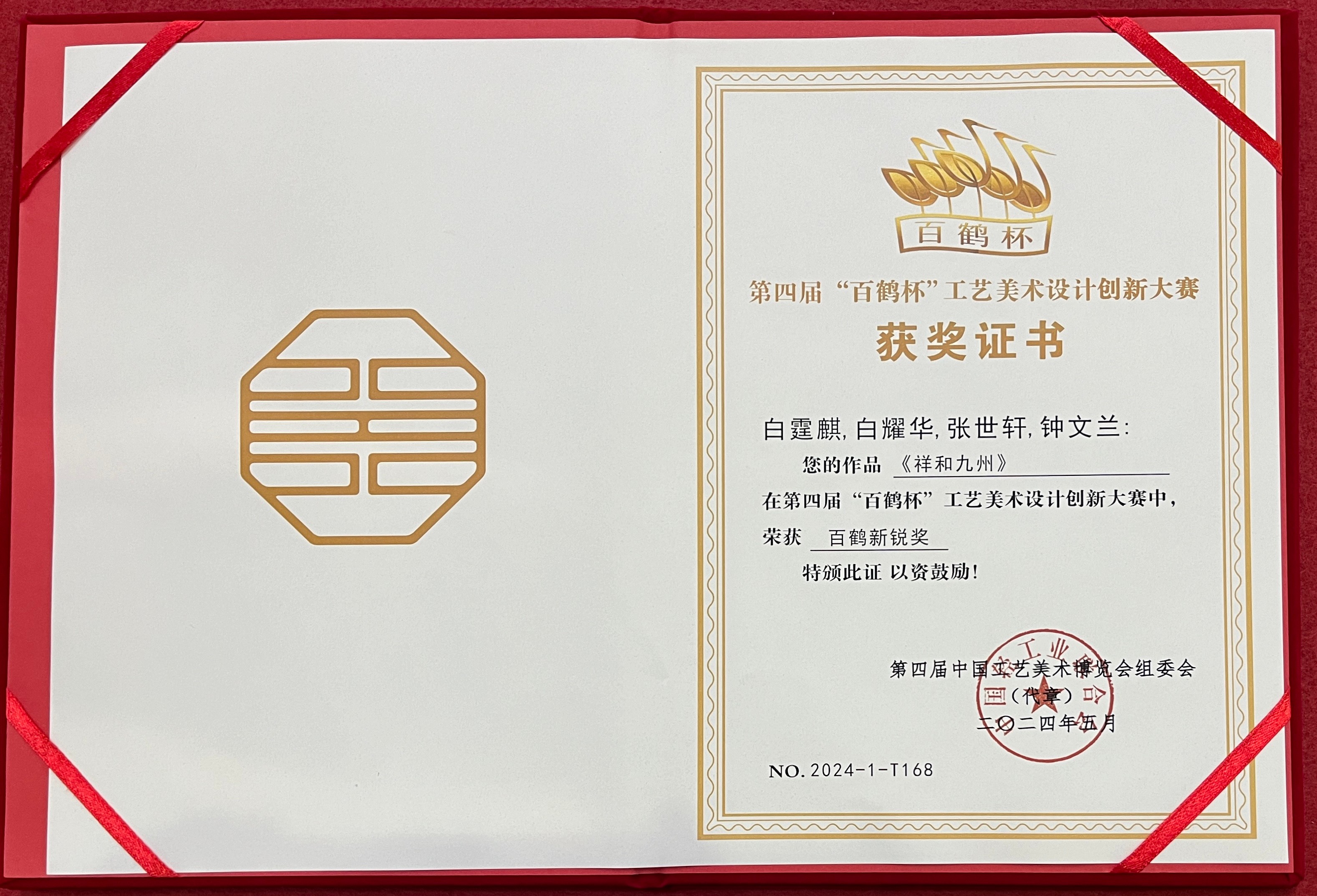 在实践指导方面,白耀华教授带领学生深入角雕创作一线,从选料、设计到雕刻,每一个环节都耐心指导,帮助学生掌握角雕技艺的精髓。他还积极参与指导青年教师,分享自己多年的创作经验与艺术理念,提升教师的教学与实践能力,助力学校打造高水平的师资队伍。在他的指导下,许多学生在各类艺术活动与比赛中崭露头角,为学校争得了荣誉,也为合浦角雕技艺的传承培养了新生力量。同时,通过与学校的合作,合浦角雕这一非遗文化在校园内得到广泛传播,丰富了校园文化内涵,促进了传统文化与现代教育的融合。此外,白耀华还获得了众多荣誉称号。2018年6月9日,他被评为“中国工艺美术大师”;2020年12月29日,荣获“广西工匠”称号;2021年8月,荣获广西五一劳动奖章。2021年,他设计、白霆麒和吴兴初制作的角雕《咏春》在第56届全国工艺品交易会仿真植物及配套用品展上荣获“金凤凰”创新产品设计大赛金奖;2023年5月,他设计的合浦金蝠《九州同庆》荣获2023年“百花杯”评审活动银奖;2024年5月,作品《祥和九州》在第四届“百鹤杯”工艺美术设计创新大赛中荣获百鹤新锐奖。