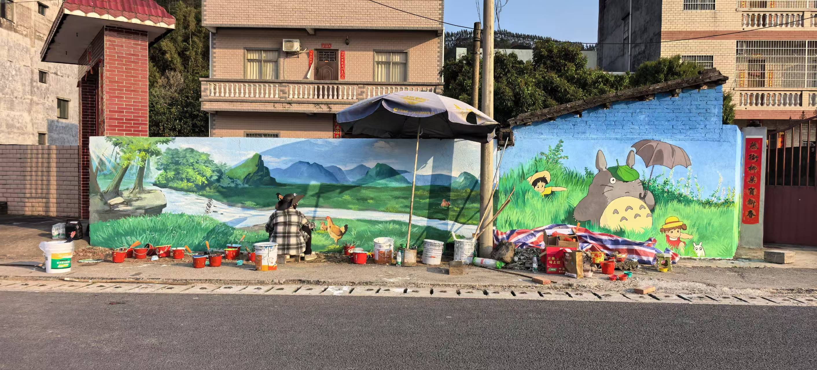 在创作中期,师生团队与村民紧密合作,共同参与到墙绘项目的每一个细节中。不仅促进了艺术与乡村文化的深度融合,还激发了村民对本土文化的认同感和自豪感。村民们纷纷表示,看到自己村庄的墙面变得如此美丽且富有文化内涵,他们感到非常骄傲和高兴。