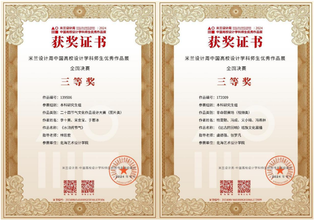 在第八届米兰设计周中国高校设计学科师生优秀作品展中,动画与传媒学院作品《生肖纹》《水墨中的武术》荣获国赛二等奖,作品《远古的回响》《乐在节气》《水浒闹节气》《药健康》荣获国赛三等奖。《传统与现代并存-弥勒》《中国高跷之乡》等12件作品荣获广西壮族自治区省赛奖项。