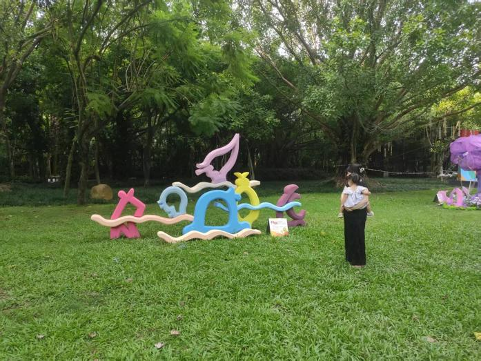 我院的作品《北部湾仲夏夜》坐落于南湖公园绿油油的草坪上,游客纷纷驻足观赏。这6种不同色彩对比、抽象构成的“鱼”形,以活泼的姿态形成了丰富而欢快的空间展示方式,点燃了广袤公园草地的空间氛围,增加公园的艺术气息与格调,给人带来了无限的想象空间与乐趣。