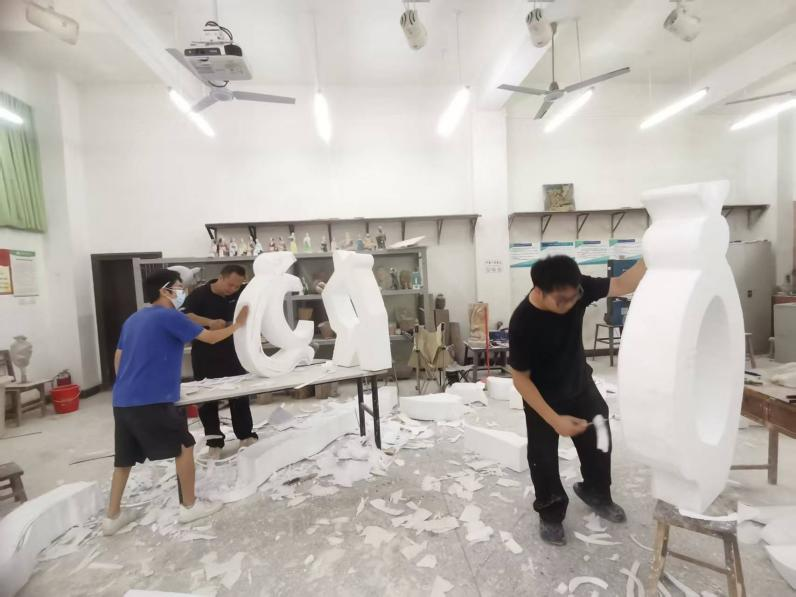 我院参加此次公共艺术周的作品名为《北部湾仲夏夜》,由雕塑教研室教师张泰莹、黄寿宁、欧安佳、杨凯、林盼鑫、金凯婧、许珍珍、覃媛媛等教师设计以及制作,共历时半个月。作品为泡沫切割成形为主,以墙漆调色上色为辅。以广西北部湾仲夏渔闲之余人们多彩的生活为背景,以不同形状及大小的海鱼为创作符号依据,对其进行提炼与简化,加以重新空间的布局与创作,作品尺寸:4mx0.8mx2m。作品表现“人”与“海”的和谐共生的主旋律。