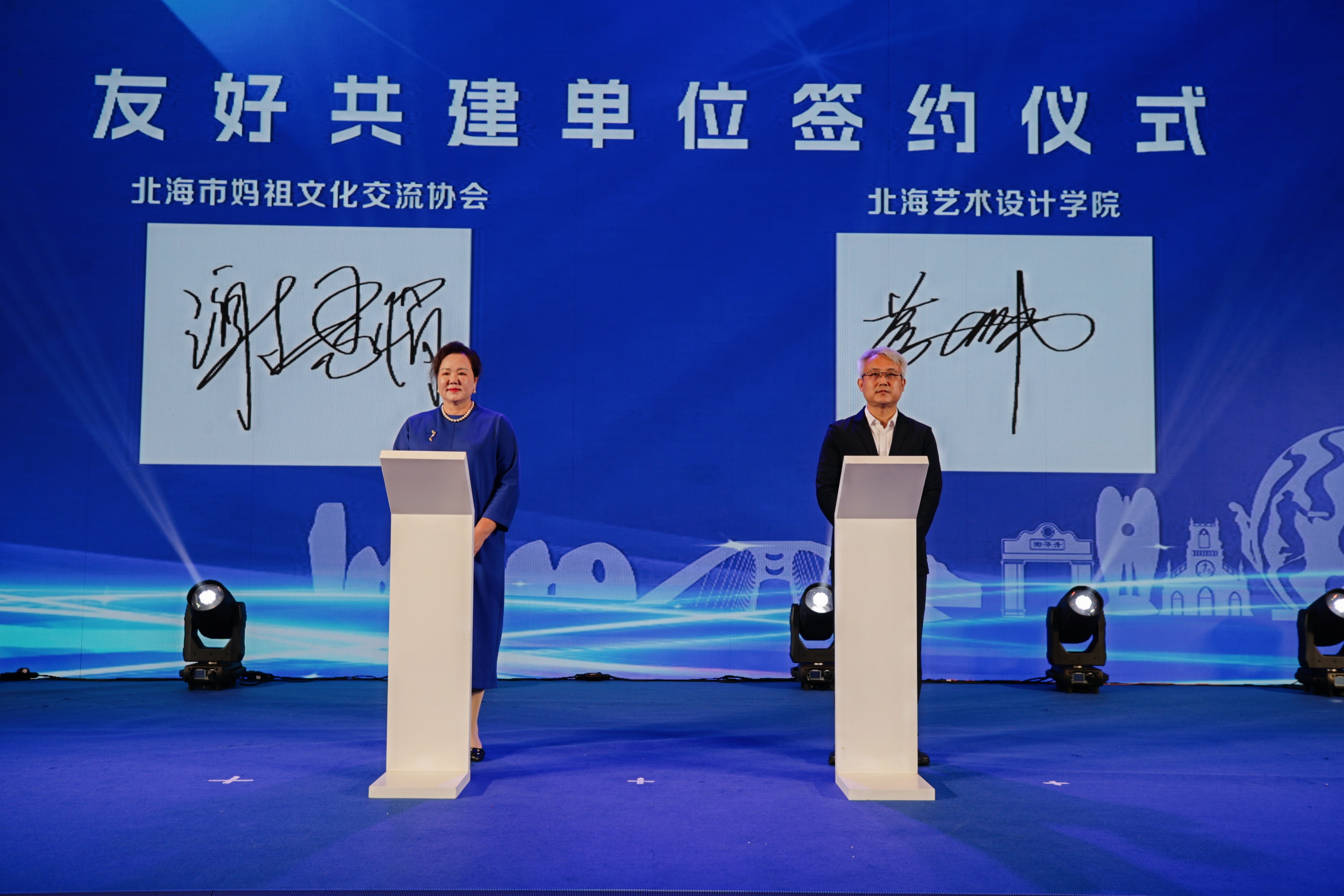 活动现场举行了系列重磅授牌、颁奖及签约仪式,为妈祖文化传承与公益实践注入多元动能。在核心战略环节的“友好共建”iPad签约仪式上,我院代表学校与广西北海妈祖文化交流协会正式签约,携手开启“文化+文旅”深度合作。双方将以此次合作为契机,积极探索文旅融合新路径,着力培养兼具创意素养与文化情怀的专业传承人才,为妈祖文化的当代活化与创新发展搭建坚实平台。此次创新形式的签约,既是校会双方合力擘画妈祖文化发展蓝图的重要举措,也为跨领域、跨行业传承弘扬妈祖精神奠定了坚实基础,充分彰显了妈祖文化“开放合作、创新发展”的时代理念。