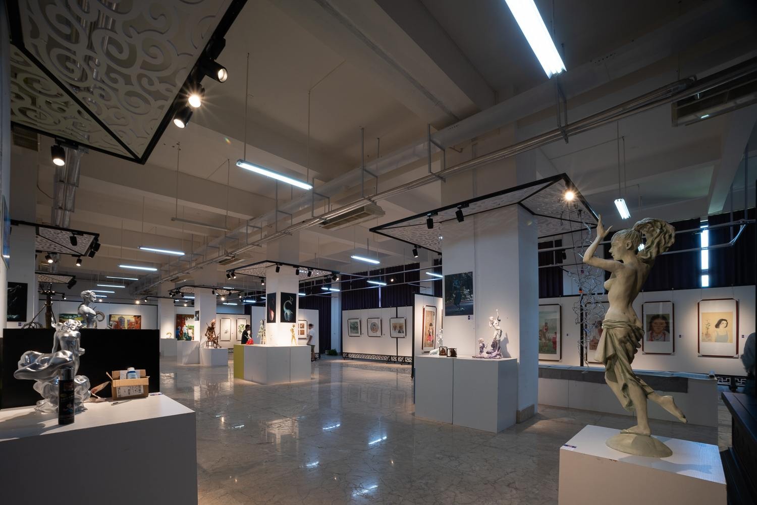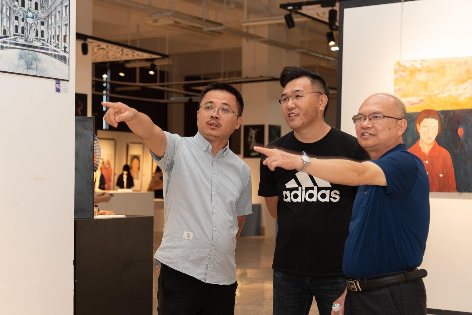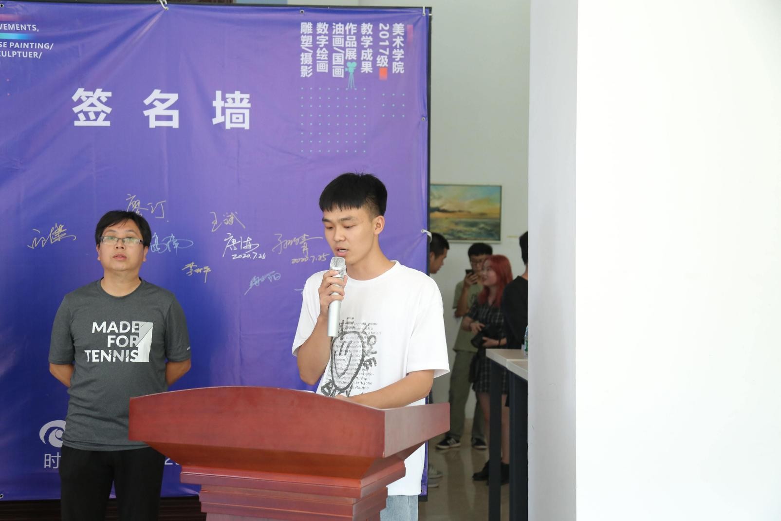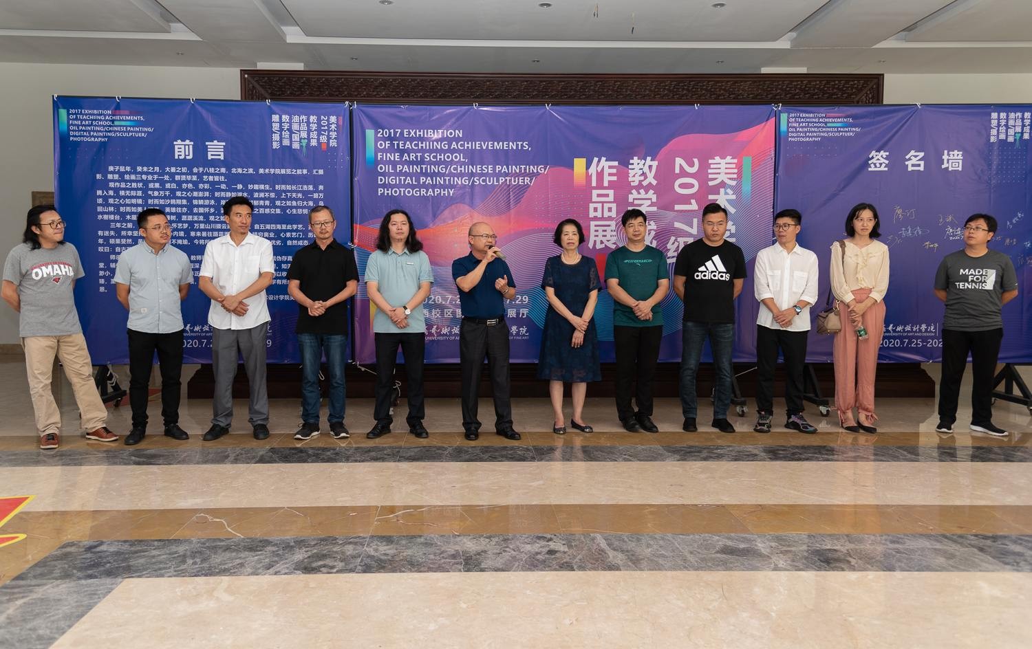 2020年7月25日(星期六)下午四点半,美术学院2017级教学成果展在西校区图书馆一楼展厅隆重开幕,此次展览共展出绘画作品127件、摄影115件、雕塑62件。我校党委书记李高南,副校长张跃、胡胜、彭仁、王斌、邱杰等校领导以及各二级学院相关领导应邀出席开幕仪式。