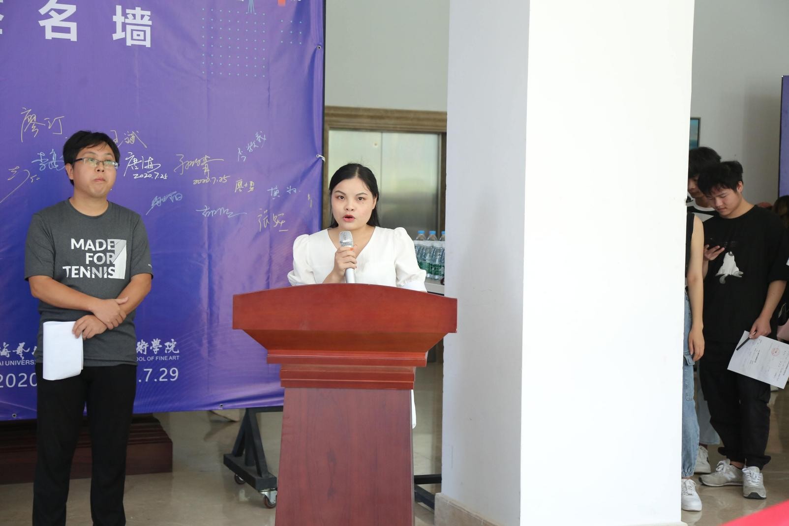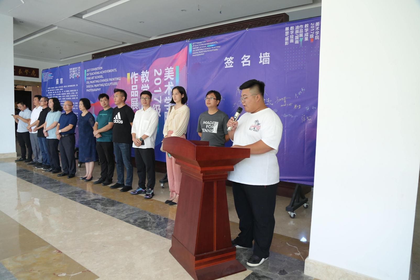 学生代表黄珍、蒋理、孙浩发言,他们回顾了初来北艺时的青涩、稚嫩,经历三年学习生活的紧张、彷徨、困惑、以及收获成功后的欣喜若狂。而今天的教学成果作品展展现的是他们三年所学,是同学和老师们共同努力的成果,同时感谢学校和老师的尊谆教诲、期以进步。