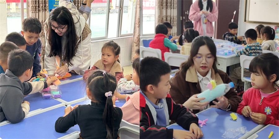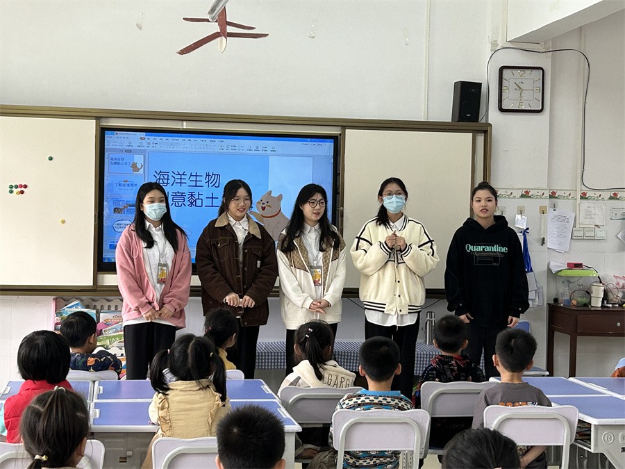课堂上,我校学前教育专业的学生积极引导小朋友讨论各自喜欢的海洋生物,并通过生动短视频引发大家对使用黏土创造作品的兴趣。在介绍相关制作过程和注意事项并分发手工黏土材料后,我校学生分组指导小朋友们进行海洋生物粘土作品创作,课堂氛围轻松活跃。