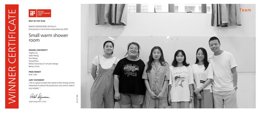 在2019年度德国iF新秀奖第二学期评选中,来自全球38个国家的参赛作品经过国际专家评审会议深入讨论与投票后,选出最优秀的52项设计 ,其中由北海艺术设计学院产品设计系5点创新设计工作室伍阳、续磊老师所指导的刘静辉、周紫莹、王艳、王嘉博同学设计的作品“Small warm shower room”(小温暖太阳能淋浴房)斩获国际大奖“iF新秀奖”(IF TALENT AWARD),并属于17项最顶尖最具创意设计之一,获得了奖金分享。这也是北海艺术设计学院产品设计专业学子首次获得该奖项。