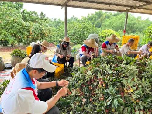 志愿者们分为两队,一队开展了助农采摘打包荔枝,另一队走到田地采摘花生,从源头了解花生的生长,亲身体会当地农民劳作的艰辛。