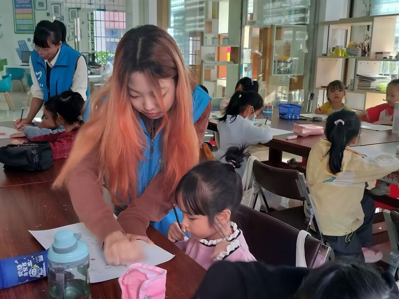 在侨北社区,志愿者们像往常一样开展绘画课程,按照准备的节奏和计划,有条不紊的进行授课。在授课过程中,氛围十分融洽,孩子们都十分乖巧,露出一双双求知若渴的大眼睛,随着志愿者们的引导和教学完成自己满意的画作。